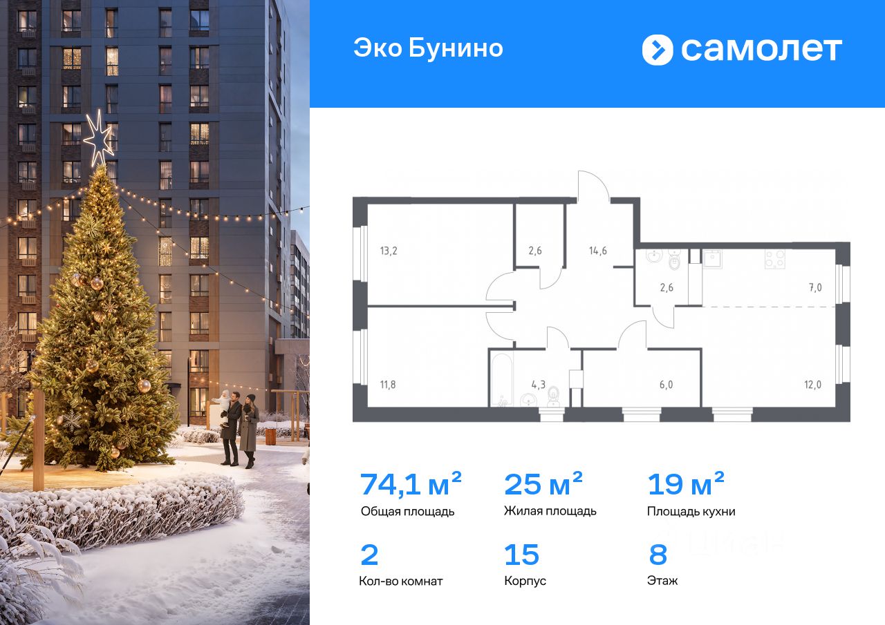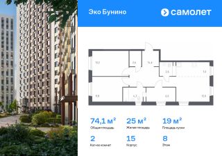 Строим кварталы для жизни с заботой о будущем. Предлагается 2-комнатная квартира комфорт-класса 74,1 кв.м в корпусе 15 на 8 этаже, в ЖК "Эко Бунино"