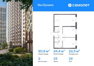 Строим кварталы для жизни с заботой о будущем. Предлагается 2-комнатная квартира комфорт-класса 60,9 кв.м в корпусе 15 на 19 этаже, в ЖК "Эко Бунино"