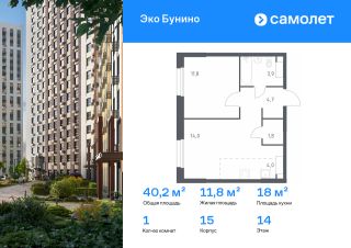 Строим кварталы для жизни с заботой о будущем. Предлагается 1-комнатная квартира комфорт-класса 40,2 кв.м в корпусе 15 на 14 этаже, в ЖК "Эко Бунино"