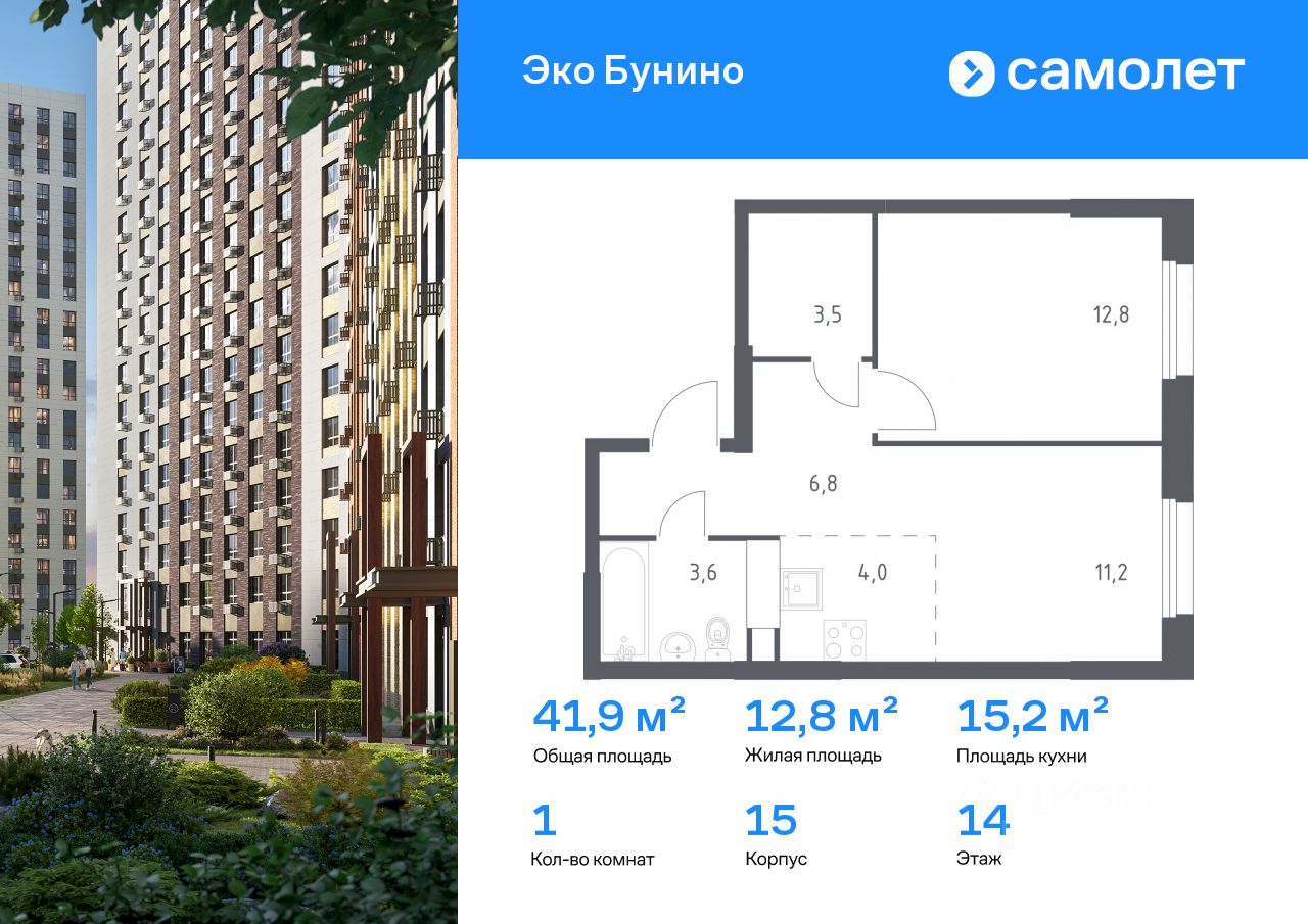 Строим кварталы для жизни с заботой о будущем. Предлагается 1-комнатная квартира комфорт-класса 41,9 кв.м в корпусе 15 на 14 этаже, в ЖК "Эко Бунино"