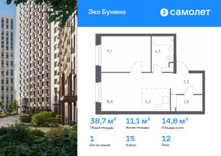 Строим кварталы для жизни с заботой о будущем. Предлагается 1-комнатная квартира комфорт-класса 38,7 кв.м в корпусе 15 на 12 этаже, в ЖК "Эко Бунино"