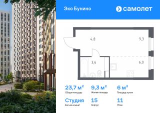 Строим кварталы для жизни с заботой о будущем. Предлагается квартира студия комфорт-класса 23,7 кв.м в корпусе 15 на 11 этаже, в ЖК "Эко Бунино"