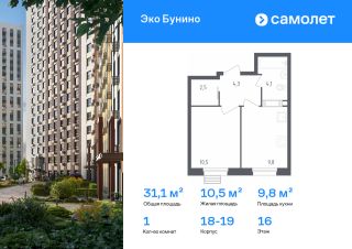 Строим кварталы для жизни с заботой о будущем. Предлагается 1-комнатная квартира комфорт-класса 31,1 кв.м в корпусе 18-19 на 16 этаже, в ЖК "Эко Бунино"