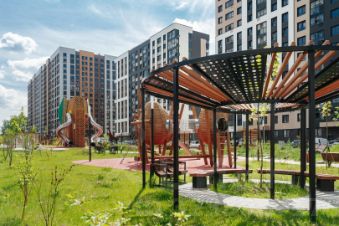 Во дворах-парках, закрытых от машин, комфортно и безопасно гулять. Здесь высажены уже взрослые деревья, которые создают прохладную тень в жаркий день.