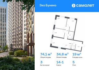 Строим кварталы для жизни с заботой о будущем. Предлагается 3-комнатная квартира комфорт-класса 74,08 кв.м в корпусе 14-1 на 5 этаже, в ЖК "Эко Бунино"