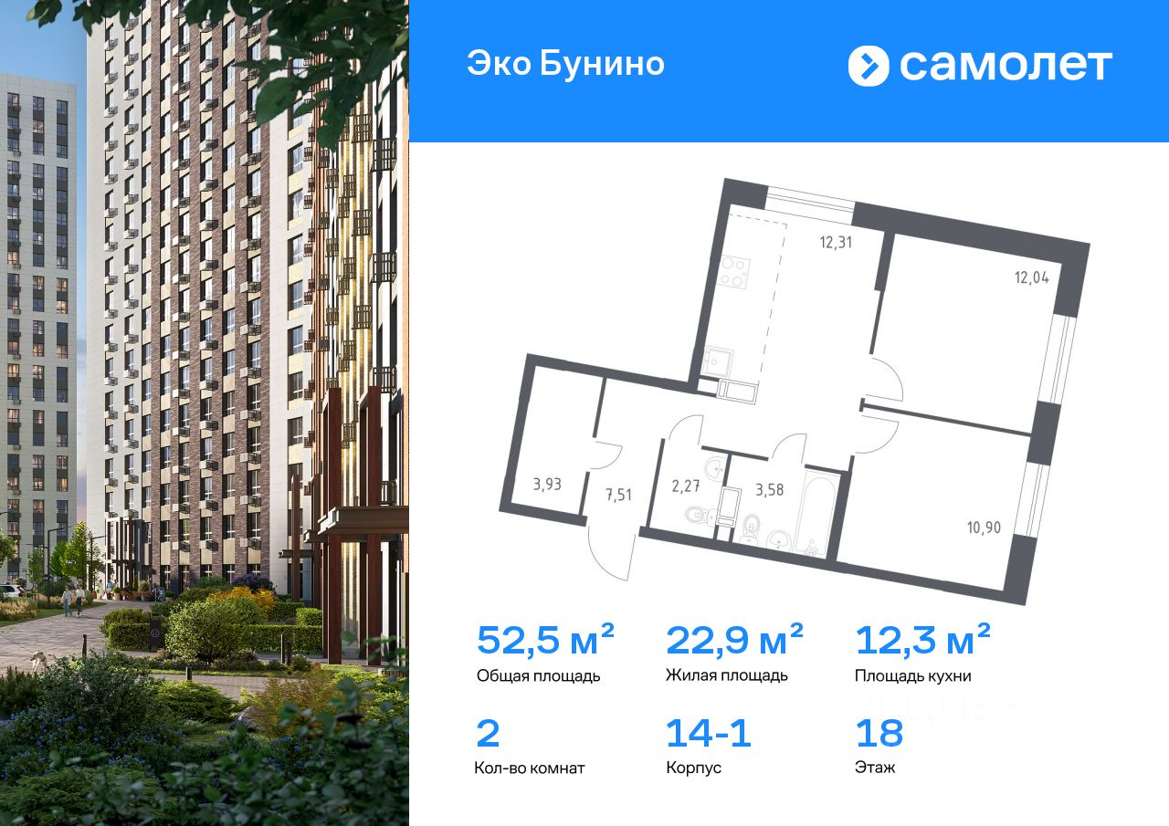 Строим кварталы для жизни с заботой о будущем. Предлагается 2-комнатная квартира комфорт-класса 52,54 кв.м в корпусе 14-1 на 18 этаже, в ЖК "Эко Бунино"