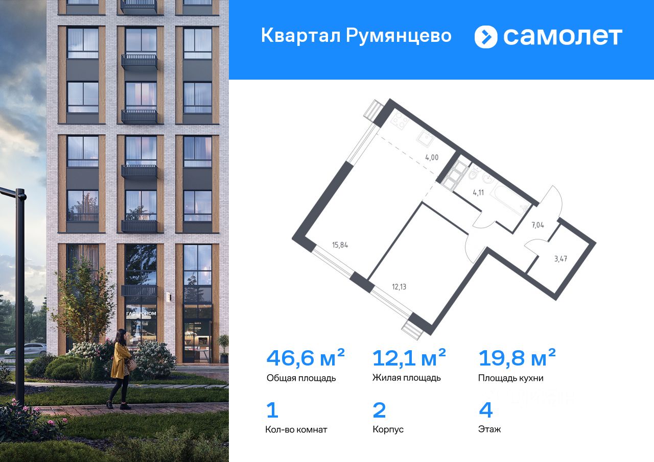 Строим кварталы для жизни с заботой о будущем. Предлагается 1-комнатная квартира комфорт-класса 46,59 кв.м в корпусе 2 на 4 этаже, в ЖК "Квартал Румянцево"