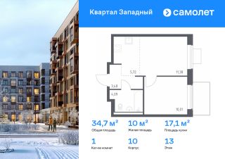 Строим кварталы для жизни с заботой о будущем. Предлагается 1-комнатная квартира комфорт-класса 34,68 кв.м в корпусе 10 на 13 этаже, в ЖК "Квартал Западный"