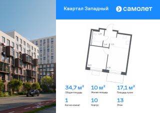 Строим кварталы для жизни с заботой о будущем. Предлагается 1-комнатная квартира комфорт-класса 34,68 кв.м в корпусе 10 на 13 этаже, в ЖК "Квартал Западный"