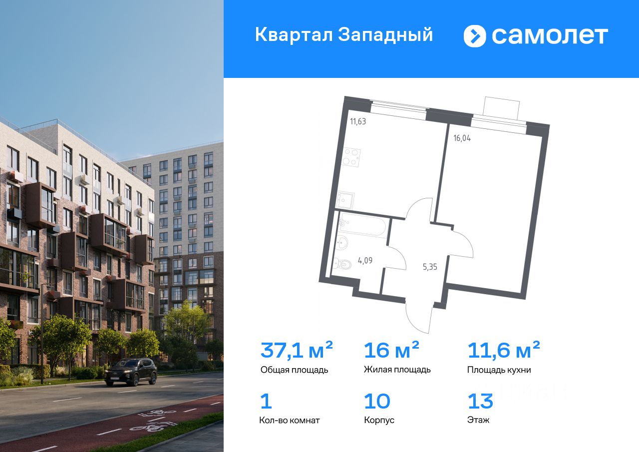 Строим кварталы для жизни с заботой о будущем. Предлагается 1-комнатная квартира комфорт-класса 37,11 кв.м в корпусе 10 на 13 этаже, в ЖК "Квартал Западный"