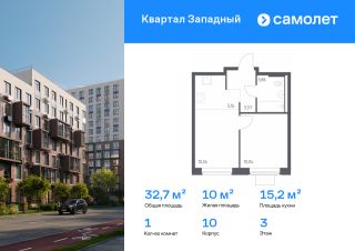 Строим кварталы для жизни с заботой о будущем. Предлагается 1-комнатная квартира комфорт-класса 32,67 кв.м в корпусе 10 на 3 этаже, в ЖК "Квартал Западный"