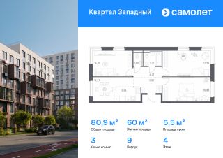 Строим кварталы для жизни с заботой о будущем. Предлагается 3-комнатная квартира комфорт-класса 80,86 кв.м в корпусе 9 на 4 этаже, в ЖК "Квартал Западный"