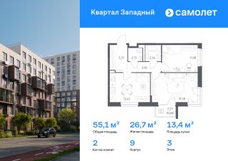 Строим кварталы для жизни с заботой о будущем. Предлагается 2-комнатная квартира комфорт-класса 55,1 кв.м в корпусе 9 на 3 этаже, в ЖК "Квартал Западный"