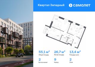 Строим кварталы для жизни с заботой о будущем. Предлагается 2-комнатная квартира комфорт-класса 55,12 кв.м в корпусе 9 на 2 этаже, в ЖК "Квартал Западный"