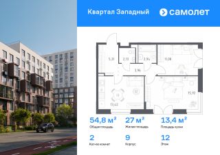 Строим кварталы для жизни с заботой о будущем. Предлагается 2-комнатная квартира комфорт-класса 54,76 кв.м в корпусе 9 на 12 этаже, в ЖК "Квартал Западный"