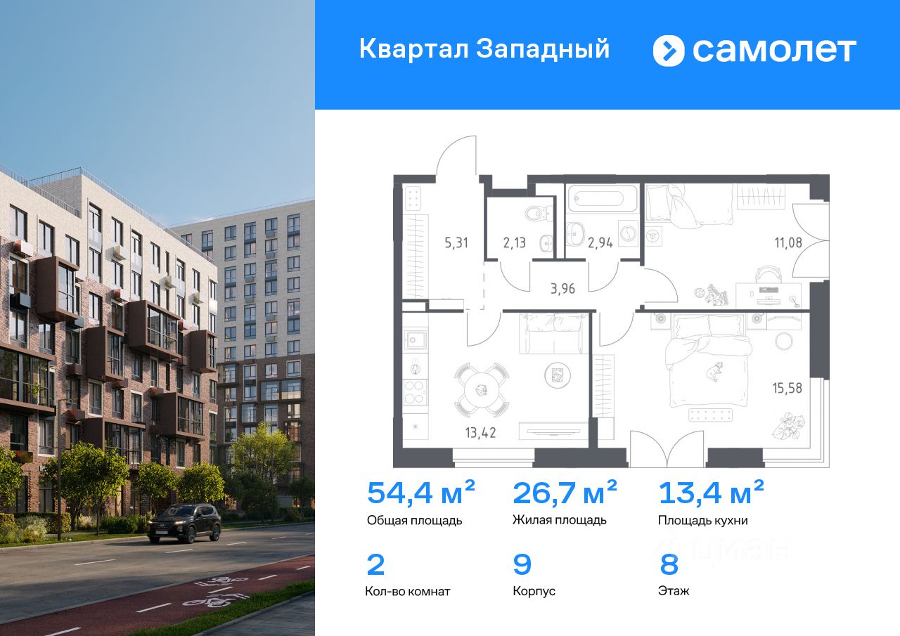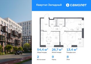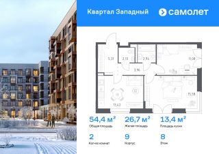Строим кварталы для жизни с заботой о будущем. Предлагается 2-комнатная квартира комфорт-класса 54,42 кв.м в корпусе 9 на 8 этаже, в ЖК "Квартал Западный"
