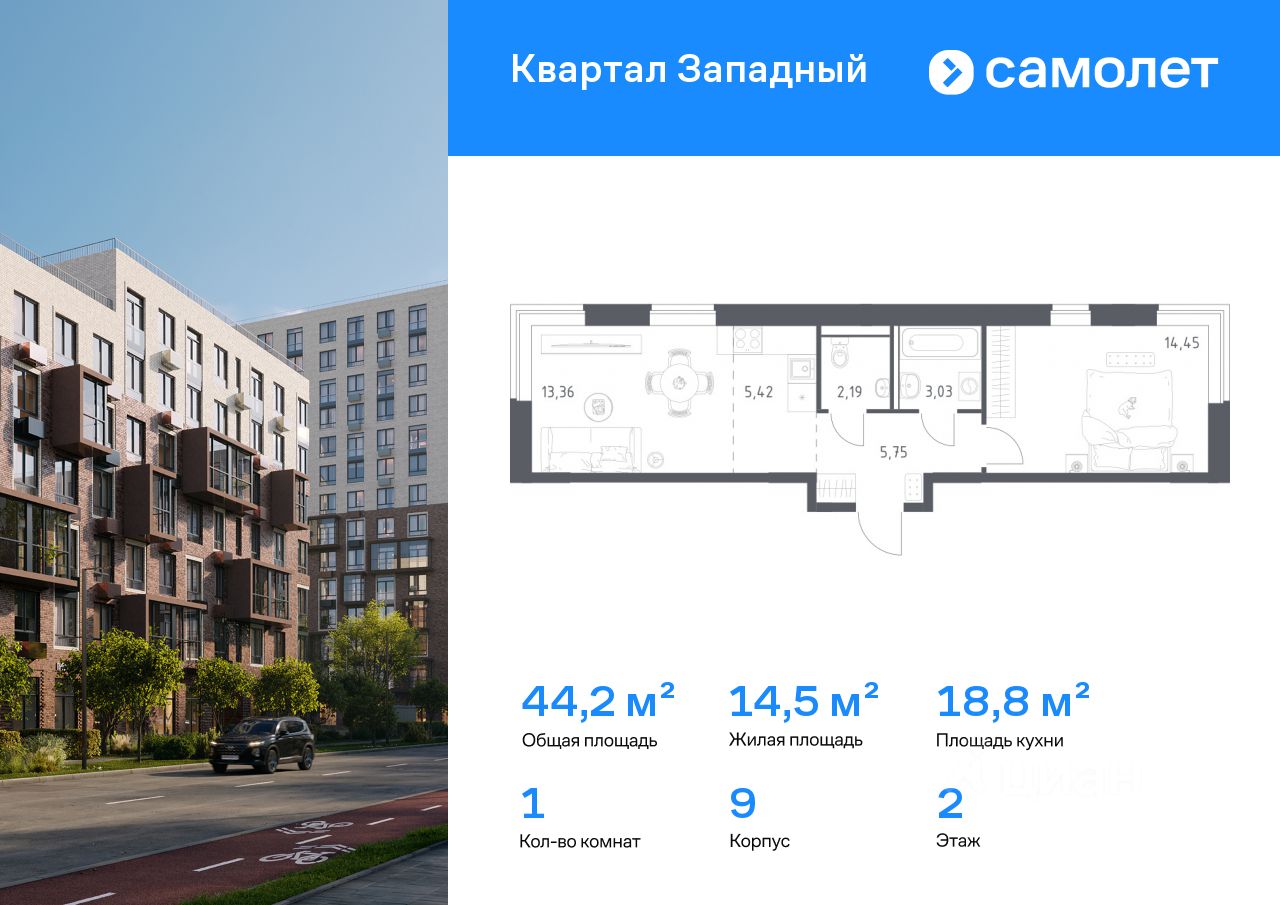 Строим кварталы для жизни с заботой о будущем. Предлагается 1-комнатная квартира комфорт-класса 44,2 кв.м в корпусе 9 на 2 этаже, в ЖК "Квартал Западный"