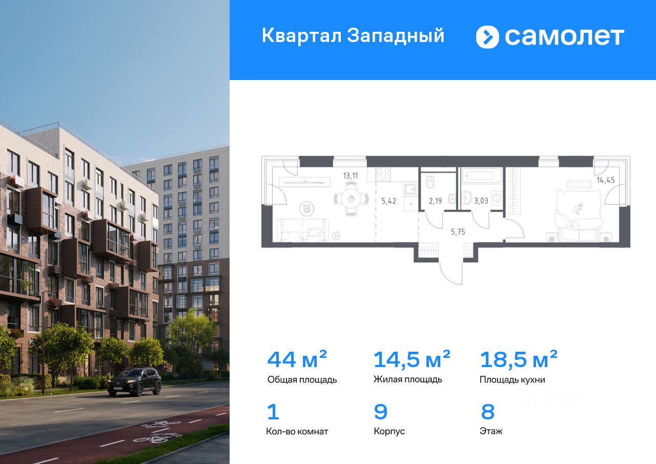 Строим кварталы для жизни с заботой о будущем. Предлагается 1-комнатная квартира комфорт-класса 43,95 кв.м в корпусе 9 на 8 этаже, в ЖК "Квартал Западный"