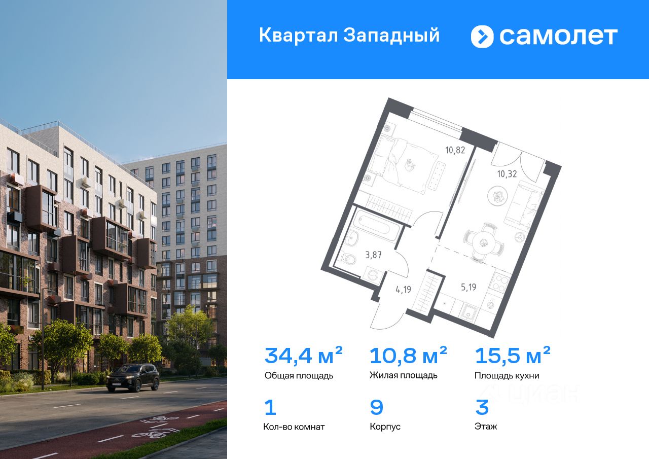 Строим кварталы для жизни с заботой о будущем. Предлагается 1-комнатная квартира комфорт-класса 34,39 кв.м в корпусе 9 на 3 этаже, в ЖК "Квартал Западный"