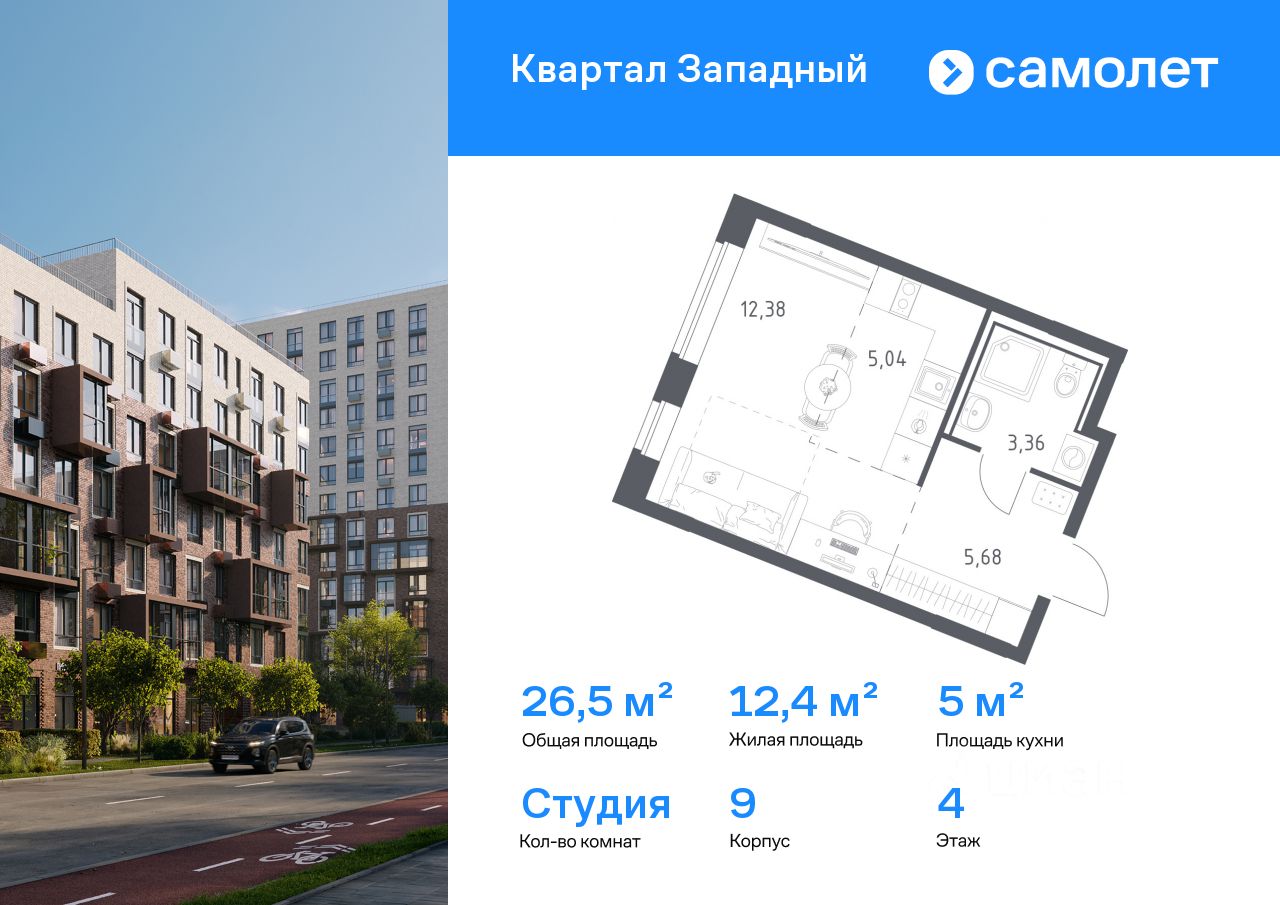 Строим кварталы для жизни с заботой о будущем. Предлагается квартира студия комфорт-класса 26,46 кв.м в корпусе 9 на 4 этаже, в ЖК "Квартал Западный"
