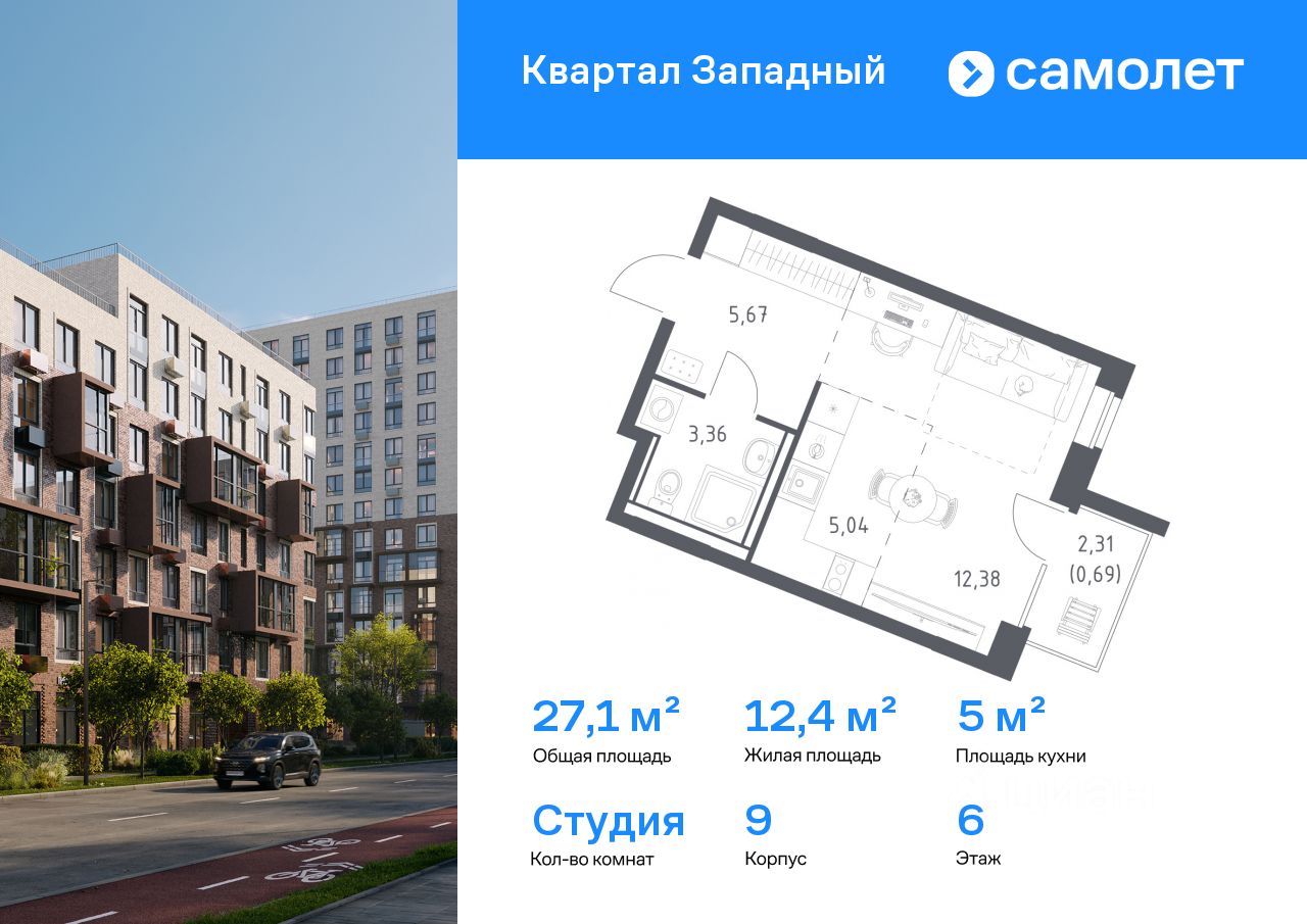 Строим кварталы для жизни с заботой о будущем. Предлагается квартира студия комфорт-класса 27,14 кв.м в корпусе 9 на 6 этаже, в ЖК "Квартал Западный"
