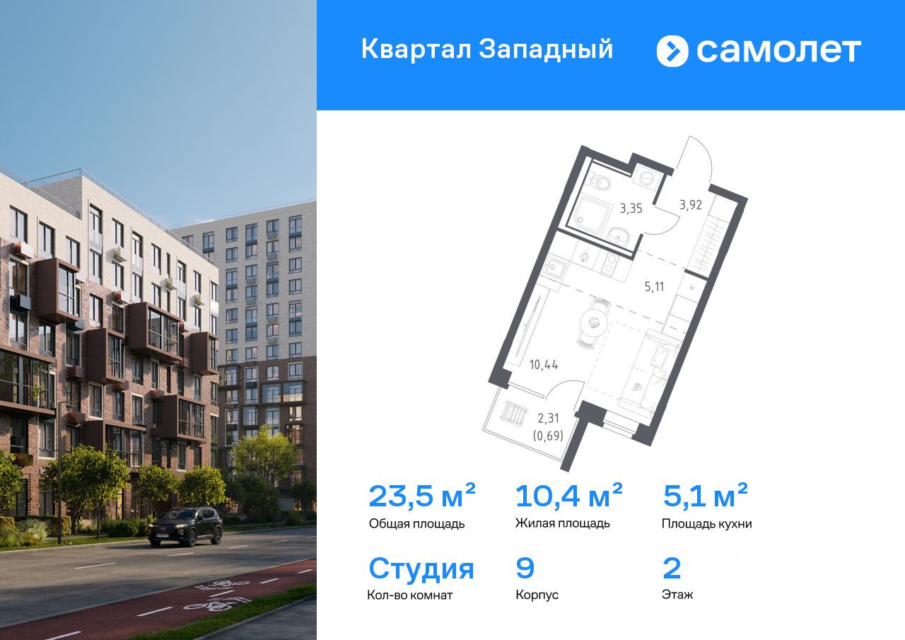 Строим кварталы для жизни с заботой о будущем. Предлагается квартира студия комфорт-класса 23,51 кв.м в корпусе 9 на 2 этаже, в ЖК "Квартал Западный"
