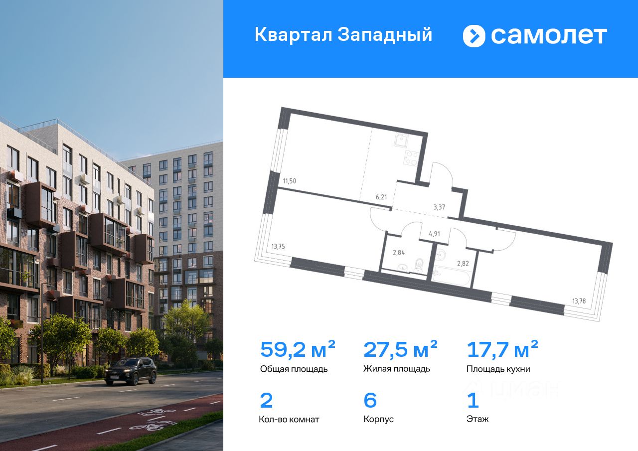 Строим кварталы для жизни с заботой о будущем. Предлагается 2-комнатная квартира комфорт-класса 59,18 кв.м в корпусе 6 на 1 этаже, в ЖК "Квартал Западный"