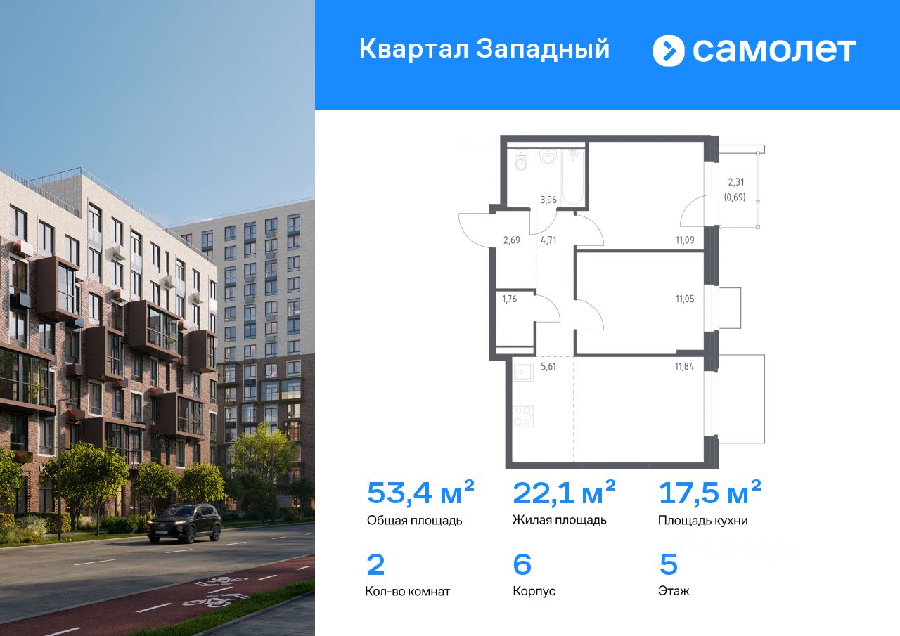 Строим кварталы для жизни с заботой о будущем. Предлагается 2-комнатная квартира комфорт-класса 53,4 кв.м в корпусе 6 на 5 этаже, в ЖК "Квартал Западный"