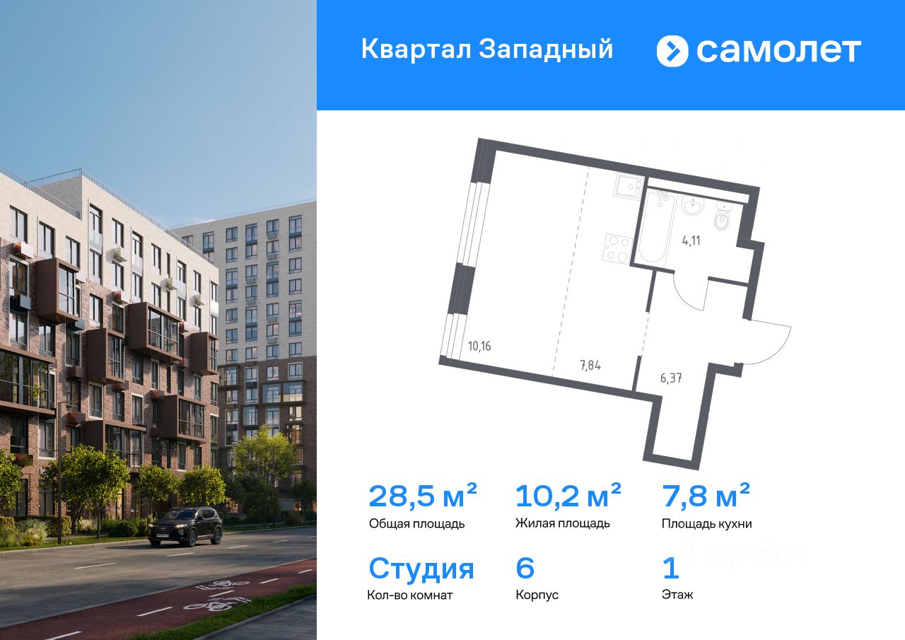 Строим кварталы для жизни с заботой о будущем. Предлагается квартира студия комфорт-класса 28,48 кв.м в корпусе 6 на 1 этаже, в ЖК "Квартал Западный"
