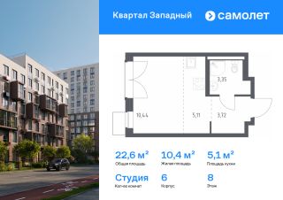 Строим кварталы для жизни с заботой о будущем. Предлагается квартира студия комфорт-класса 22,62 кв.м в корпусе 6 на 8 этаже, в ЖК "Квартал Западный"