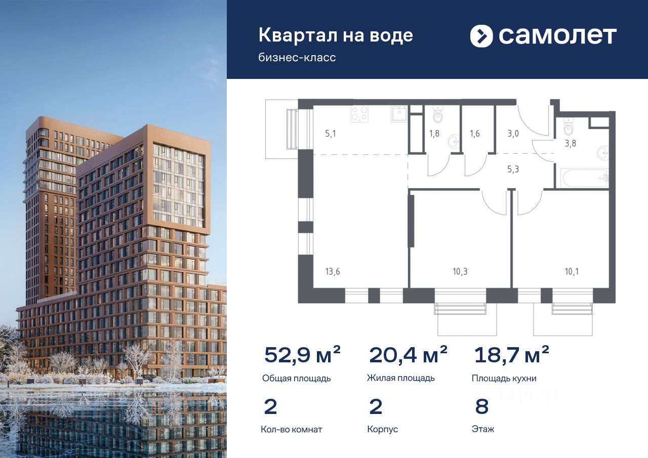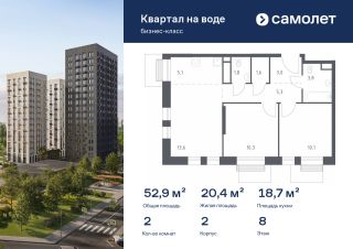 Строим кварталы для жизни с заботой о будущем. Предлагается 2-комнатная квартира бизнес-класса 52,9 кв.м в корпусе 2 на 8 этаже, в ЖК "Квартал на воде"