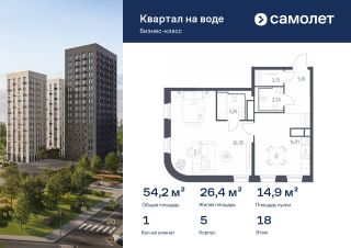 Строим кварталы для жизни с заботой о будущем. Предлагается 1-комнатная квартира бизнес-класса 54,24 кв.м в корпусе 5 на 18 этаже, в ЖК "Квартал на воде"