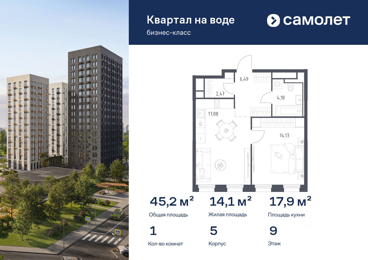 Строим кварталы для жизни с заботой о будущем. Предлагается 1-комнатная квартира бизнес-класса 45,15 кв.м в корпусе 5 на 9 этаже, в ЖК "Квартал на воде"