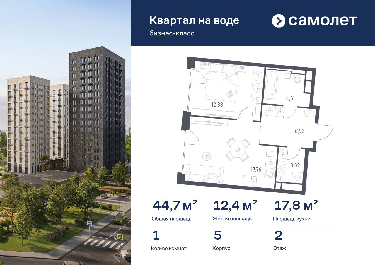 Строим кварталы для жизни с заботой о будущем. Предлагается 1-комнатная квартира бизнес-класса 44,69 кв.м в корпусе 5 на 2 этаже, в ЖК "Квартал на воде"