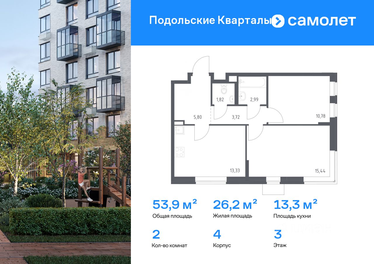 Строим кварталы для жизни с заботой о будущем. Предлагается 2-комнатная квартира комфорт-класса 53,88 кв.м в корпусе 4 на 3 этаже, в ЖК "Подольские Кварталы"