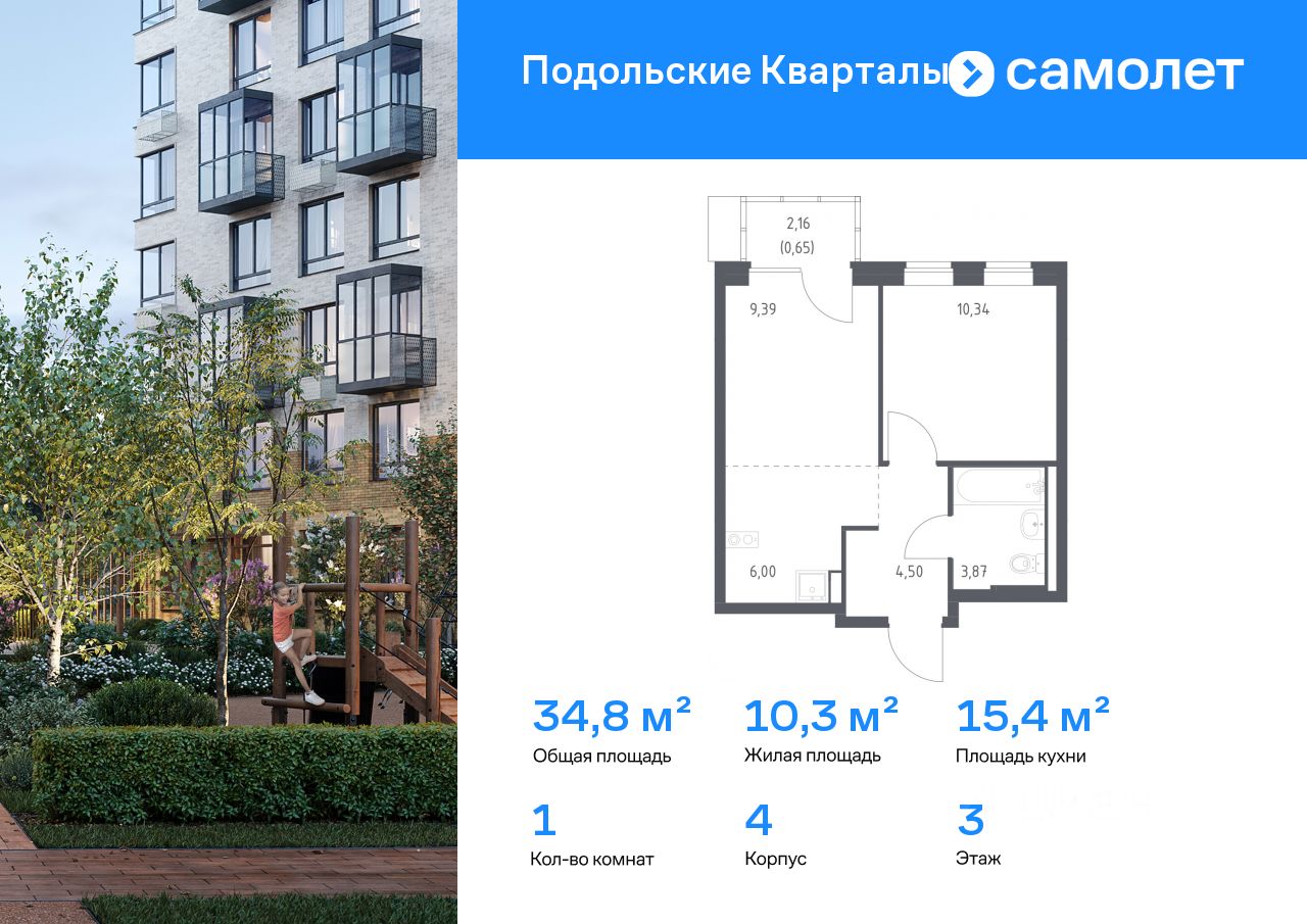 Строим кварталы для жизни с заботой о будущем. Предлагается 1-комнатная квартира комфорт-класса 34,75 кв.м в корпусе 4 на 3 этаже, в ЖК "Подольские Кварталы"