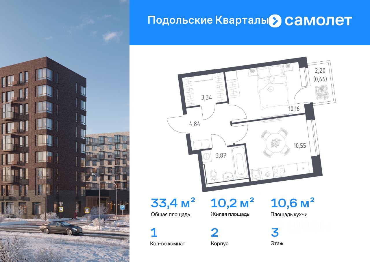 Строим кварталы для жизни с заботой о будущем. Предлагается 1-комнатная квартира комфорт-класса 33,42 кв.м в корпусе 2 на 3 этаже, в ЖК "Подольские Кварталы"