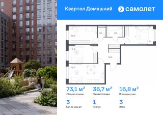 Строим кварталы для жизни с заботой о будущем. Предлагается 3-комнатная квартира комфорт-класса 73,11 кв.м в корпусе 1 на 3 этаже, в ЖК "Квартал Домашний"