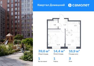Строим кварталы для жизни с заботой о будущем. Предлагается 1-комнатная квартира комфорт-класса 39,57 кв.м в корпусе 1 на 3 этаже, в ЖК "Квартал Домашний"