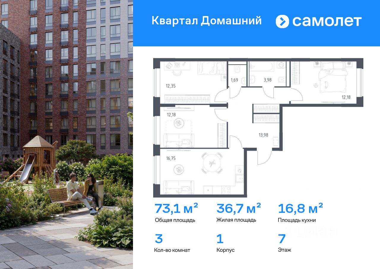 Строим кварталы для жизни с заботой о будущем. Предлагается 3-комнатная квартира комфорт-класса 73,11 кв.м в корпусе 1 на 7 этаже, в ЖК "Квартал Домашний"
