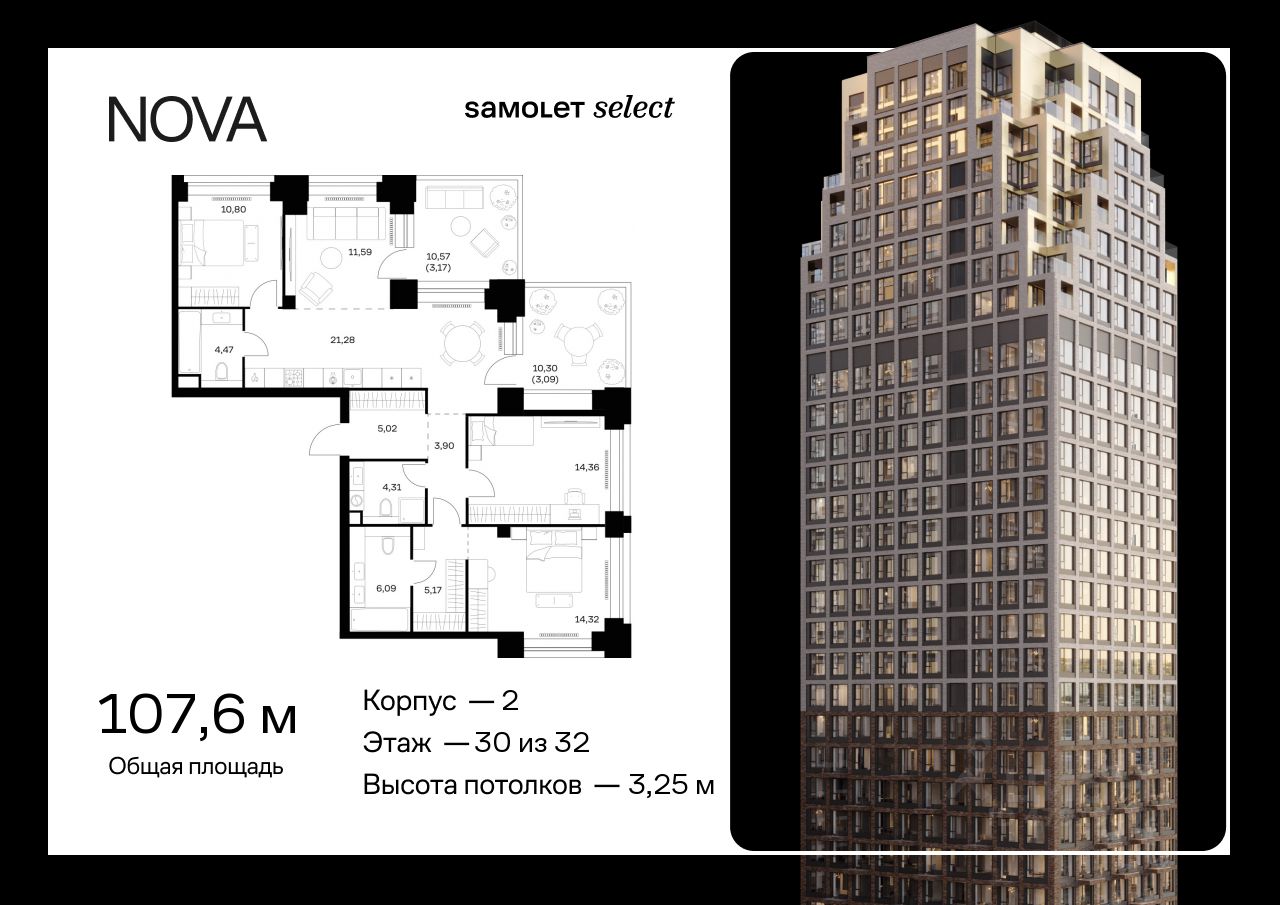 Строим кварталы для жизни с заботой о будущем. Предлагается 3-комнатная квартира премиум-класса 107,57 кв.м в корпусе 2 на 30 этаже, в ЖК "NOVA"