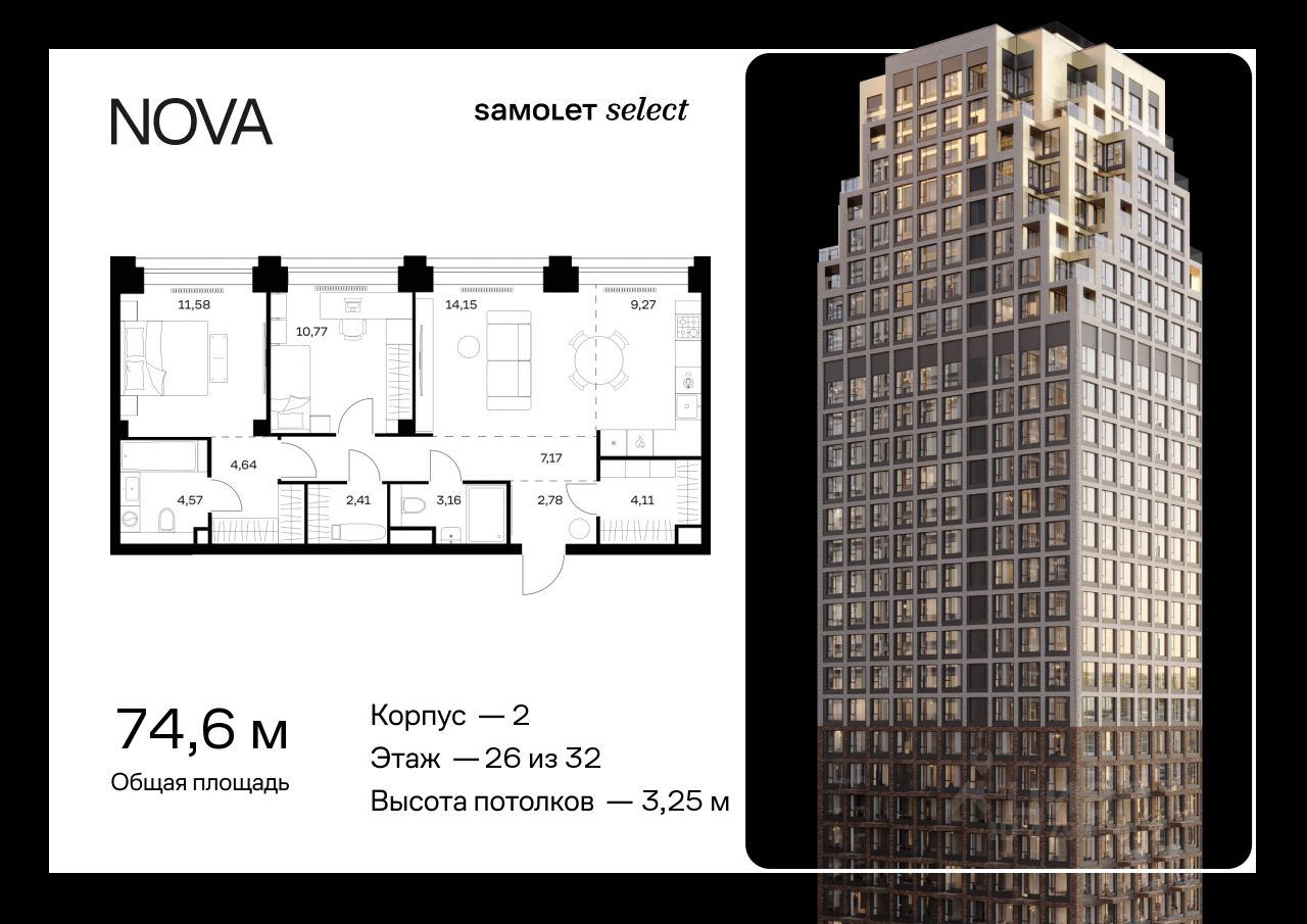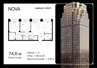 Строим кварталы для жизни с заботой о будущем. Предлагается 2-комнатная квартира премиум-класса 74,61 кв.м в корпусе 2 на 26 этаже, в ЖК "NOVA"
