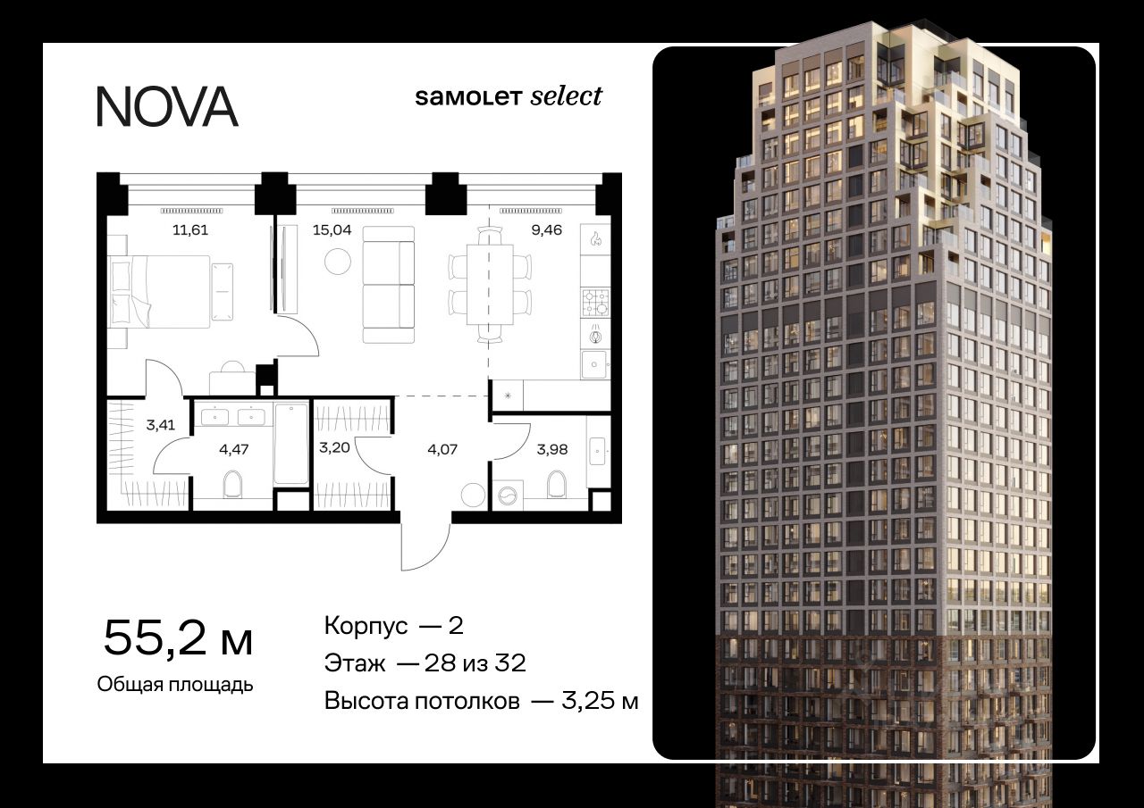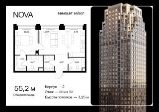 Строим кварталы для жизни с заботой о будущем. Предлагается 1-комнатная квартира премиум-класса 55,24 кв.м в корпусе 2 на 28 этаже, в ЖК "NOVA"