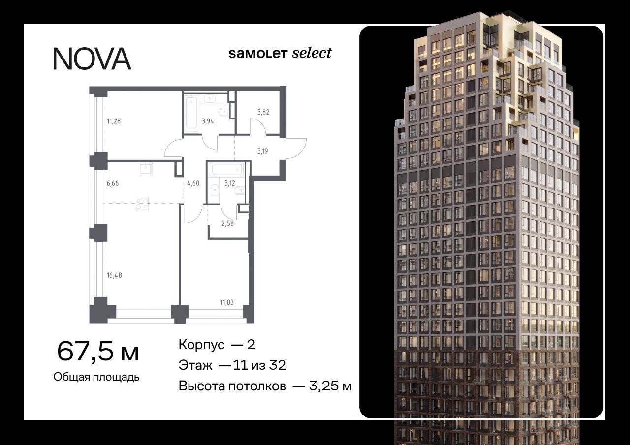 Строим кварталы для жизни с заботой о будущем. Предлагается 2-комнатная квартира премиум-класса 67,5 кв.м в корпусе 2 на 11 этаже, в ЖК "NOVA"