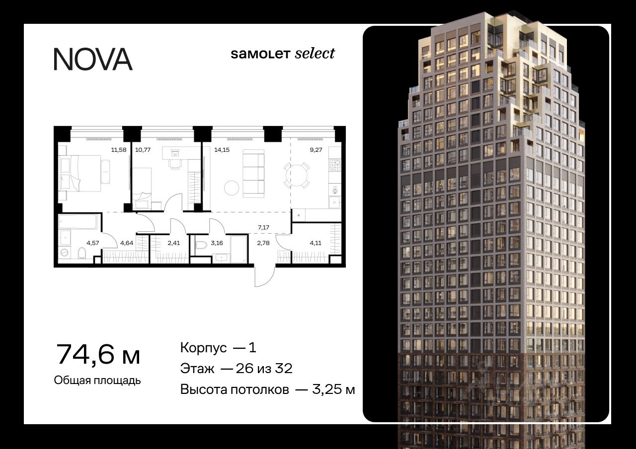 Строим кварталы для жизни с заботой о будущем. Предлагается 2-комнатная квартира премиум-класса 74,61 кв.м в корпусе 1 на 26 этаже, в ЖК "NOVA"