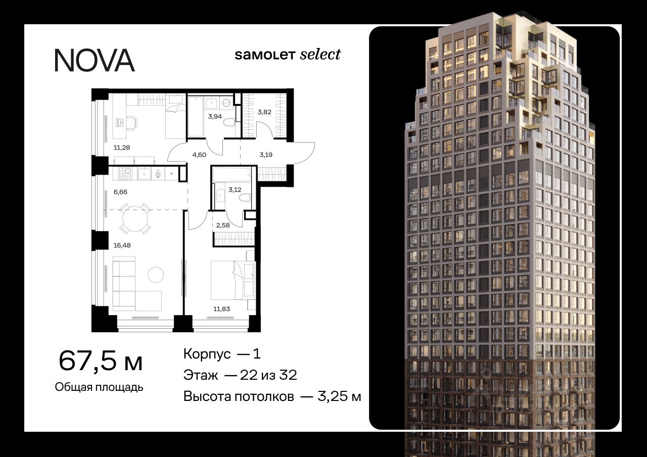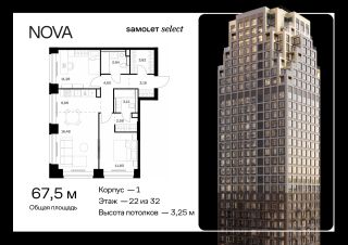 Строим кварталы для жизни с заботой о будущем. Предлагается 2-комнатная квартира премиум-класса 67,5 кв.м в корпусе 1 на 22 этаже, в ЖК "NOVA"