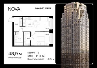Строим кварталы для жизни с заботой о будущем. Предлагается 1-комнатная квартира премиум-класса 48,93 кв.м в корпусе 1 на 14 этаже, в ЖК "NOVA"