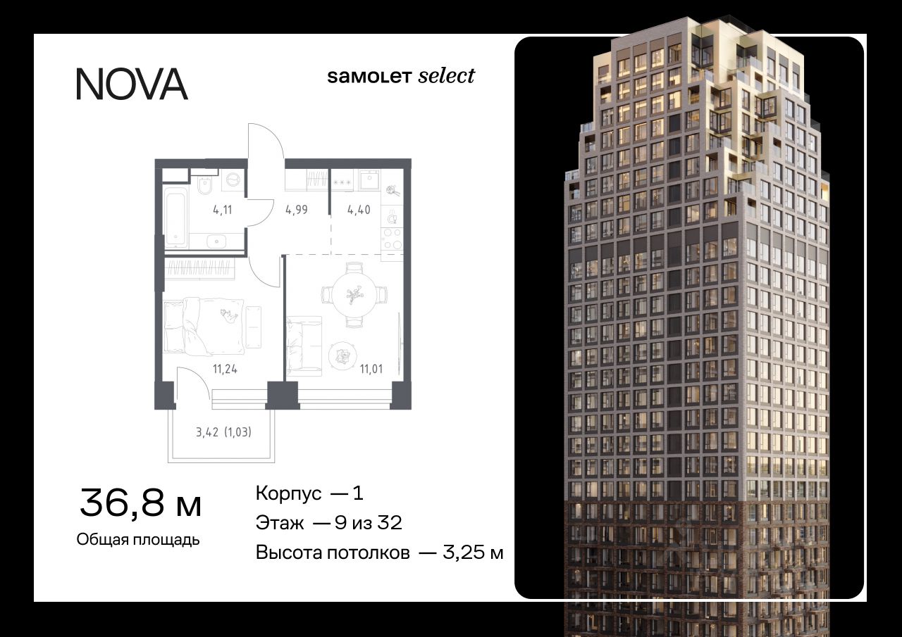 Строим кварталы для жизни с заботой о будущем. Предлагается 1-комнатная квартира премиум-класса 36,78 кв.м в корпусе 1 на 9 этаже, в ЖК "NOVA"