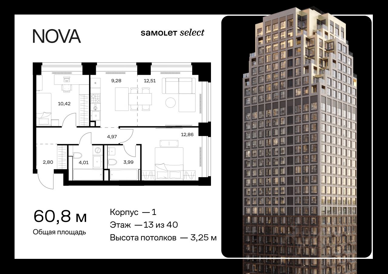 Строим кварталы для жизни с заботой о будущем. Предлагается 2-комнатная квартира премиум-класса 60,84 кв.м в корпусе 1 на 13 этаже, в ЖК "NOVA"