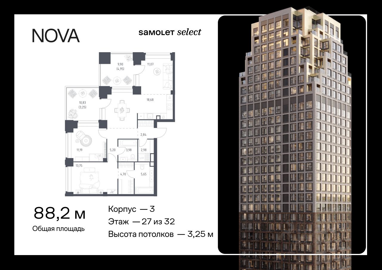 Строим кварталы для жизни с заботой о будущем. Предлагается 2-комнатная квартира премиум-класса 88,24 кв.м в корпусе 3 на 27 этаже, в ЖК "NOVA"